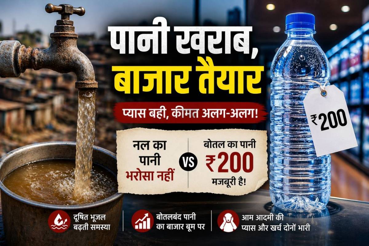 Drinking Water Crisis bottle water demand: नल का पानी न जानें अब कैसा आए... नगर निगम की पाइपलाइन से टूटता भरोसा अब हर आम आदमी के जहन में है क्या यह पीने लायक है? शहरों से लेकर कस्बों तक पानी की उपलब्धता नहीं, बल्कि साफ और सुरक्षित पानी लोगों के सामने सबसे बड़ी चुनौती बन गया है। यही कारण है कि बोतलबंद पानी का बाजार तेजी से फल-फूल रहा है और मजबूरी में लोग अपनी जेब ढीली कर रहे हैं। कहीं 20 रुपए की 1 लीटर पानी की बोतल है, तो कहीं वही पानी की बोतल 100-200 रुपए में बिक रही है। पानी की शुद्धता और सुरक्षा के नाम पर चल रहे इस पूरे खेल के बीच आम आदमी अपनी प्यास और खर्च दोनों के लिए संघर्ष कर रहा है।