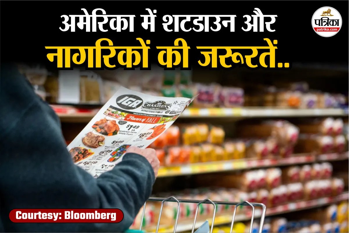 यूएस में शटडाउन के दौरान मॉल में रखा रोजाना की जरूरत का सामान। फोटो: ब्लूमबर्ग, डिजाइन : पत्रिका