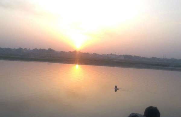 आगरा में यमुना किनारे बल्केश्वर घाट पर सूर्योदय के दौरान सूर्य की छाया जल में।