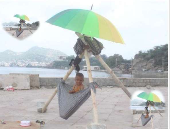 अजमेर. आनासागर चौपाटी पर काम करते मजदूर जो अपने बच्चों को साथ लाने को मजबूूर हैं क्योंकि पापी पेट का सवाल है साब । इसके लिए सब कुछ करना पड़ता है। परन्तु मां की ममता भी अपने बच्चों की सुरक्षा के लिए कोई ना कोई जुगाड़ लगा ही लेती है। बच्चे को झूले में धूप से बचाने के लिए छाता लगा दिया