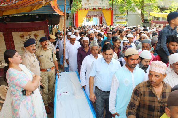 अजमेर. केसरगंज स्थित ईदगाह में ईदुलजुहा की नमाज खत्म होने के बाद ईदगाह से निकलते नमाजी एवं मौजूद जिला कलक्टर डॉ. दीक्षित, एसपी विश्नोई अन्य।