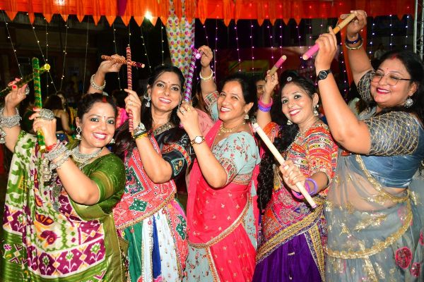 महारास डांडिया में डांडियों के संग उत्साह दर्शाती युवतियां।