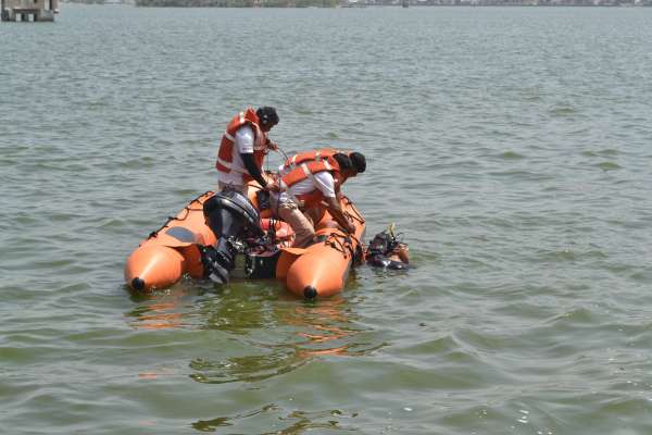 एसडीआरएफ के जवानों मॉक ड्रिल में झील में डिप डाईविंग सेट से शव को निकालने, बहते पानी से राहत एवं बचाव का अभ्यास किया गया।
