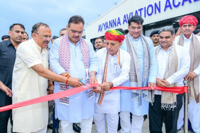 किशनगढ़ एयरपोर्ट पर विधिवत फीता काटकर पायलट प्रशिक्षण एकेडमी का उद्घाटन करते मुख्यमंत्री भजनलाल शर्मा व अन्य अतिथि।