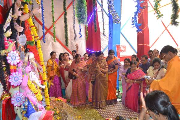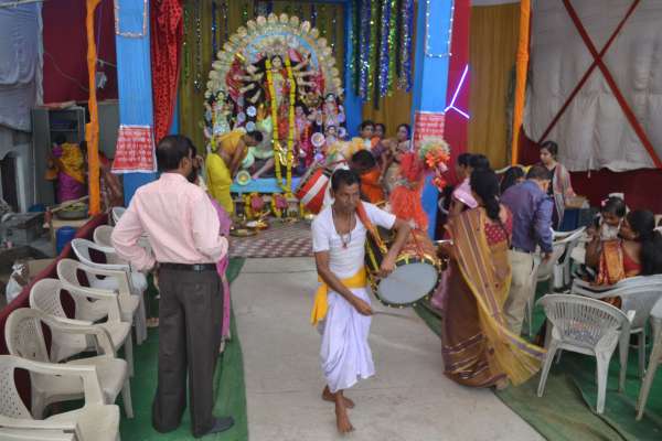 कचहरी रोड स्थित बंगाली धर्मशाला में माता दुर्गा की पूजा अर्चना करते बंगाली समाज के लोग