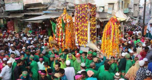 हरा लिबास पहने युवकों, बुजुर्गों और बच्चों ने चमचमाती तलवारों से हाईदौस में हिस्सा लिया।