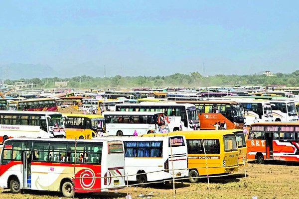 अजमेर की कायड़ विश्राम स्थली में प्रधानमंत्री नरेन्द्र मोदी की आमसभा के दौरान पार्किंग में दूर तक खड़ी बसें।