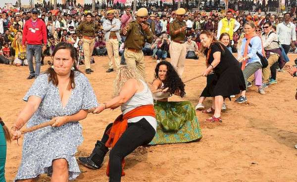 अजमेर पुष्कर मेला मैदान में सोमवार को समापन के दौरान देसी व विदेशी महिलाओं के बीच रस्सा कस्सी का आयोजन हुआ।
