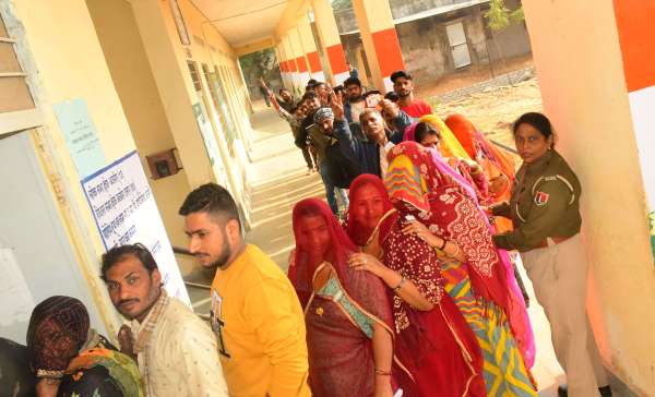 अजमेर के प्लाजा सिनेमा रोड स्थित आर्य पुत्री स्कूल में मतदान के लिए लोगों की लंबी कतार नजर आई