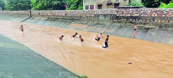 पुष्कर में लबालब खरेखडी फीडर से बहती नदी में जान जोखिम में डालकर मस्ती करते बच्चे