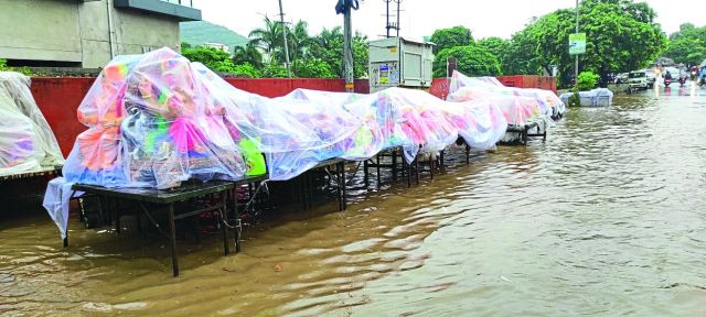 बरसात के दौरान तिरपाल से ढंककर रखी गई गजानन की प्रतिमाएं