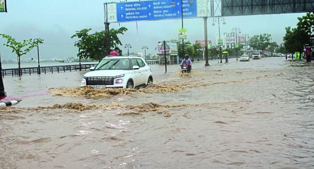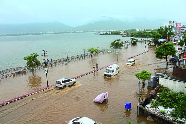 बरसात के बाद लबालब आनासागर, चौपाटी और सड़क भी जलमग्न