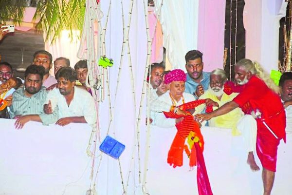 किशनगढ़ में प्राचीन बालाजी मेले के दौरान लहरिए की रस्म निभाते केंद्रीय कृषि राज्यमंत्री भागीरथ चौधरी व मंदिर पुजारी।