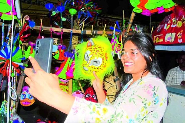 किशनगढ़ के प्राचीन बालाजी मेले के दौरान मुखौटे के साथ सेल्फी लेती युवती।