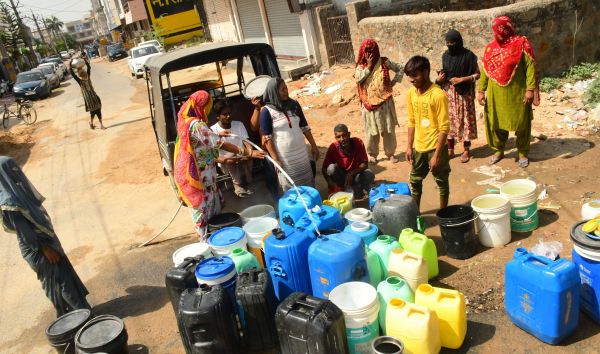 माकड़वाली रोड देवनगर अपने दुपहिया वाहन पर पानी भरकर ले जाता युवक। 14:19