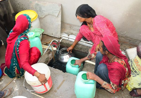 अजमेर के माकड़ वाली रोड स्थित देवनगर में बीसलपुर पाइपलाइन का पानी नहीं पहुंचने पर दूर दराज से यूं सड़क पार कर पानी भरने जाती महिलाएं। फोटो जय माखीजा