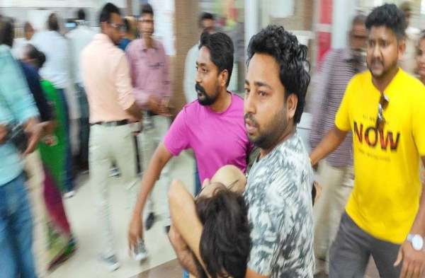 अस्पताल में हाथ जोड़कर चिकित्सकों से गुहार करती युवक की पत्नी।