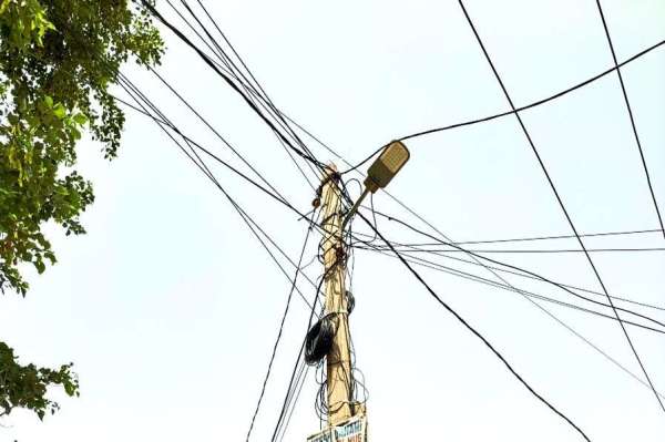 बहरोड़. बिजली खंभों पर लटक रहा केबल का गुच्छा।