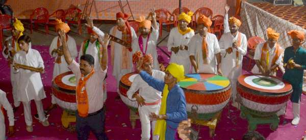 अलवर शहर में भाजपा की परिवर्तन यात्रा के स्वागत में प्रस्तुति देते कलाकार