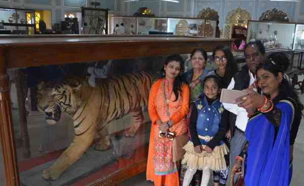 अलवर म्यूजियम में पर्यटक टाइगर के साथ सेल्फी लेते हुए