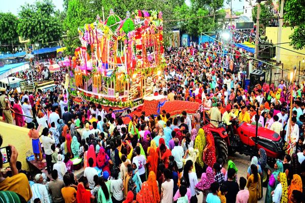 भगवान जगन्नाथ जानकी मैया को ब्याहकर गाजेबाजे के साथ रथ में सवार होते हुए।