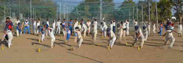 अलवर के राजर्षि खेल मैदान पर क्रिकेट का अभ्यास करते खिलाड़ी।