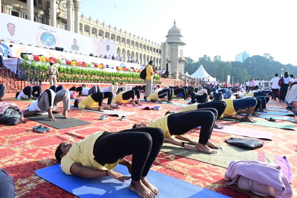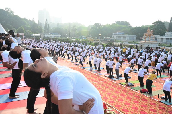बेंगलूरु में अंतर्राष्ट्रीय योग दिवस के मौके पर विधान सौधा परिसर में योगाभ्यास करते लोग।