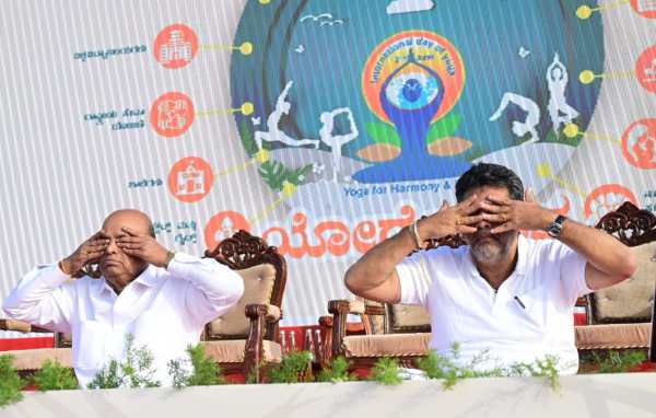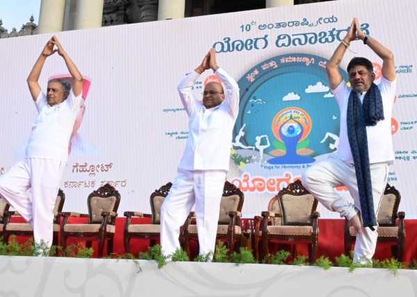 बेंगलूरु में अंतर्राष्ट्रीय योग दिवस के मौके पर विधान सौधा परिसर में योगाभ्यास करते कर्नाटक के राज्यपाल थावर चंद गहलोत, कर्नाटक विधान परिषद के अध्यक्ष बसवराज होरट्टी, उप मुख्यमंत्री डीके शिवकुमार, मंत्री दिनेश गुंडूराव के साथ अन्य।