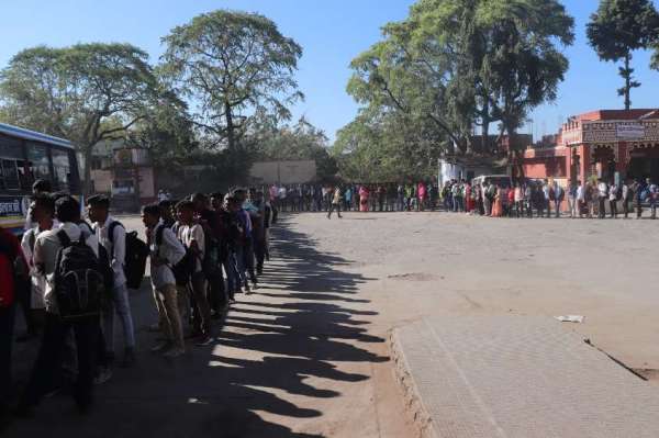 परीक्षा देने जाने के लिए बांसवाड़ा बस डिपो में लाइन में लगे अभ्यर्थी।