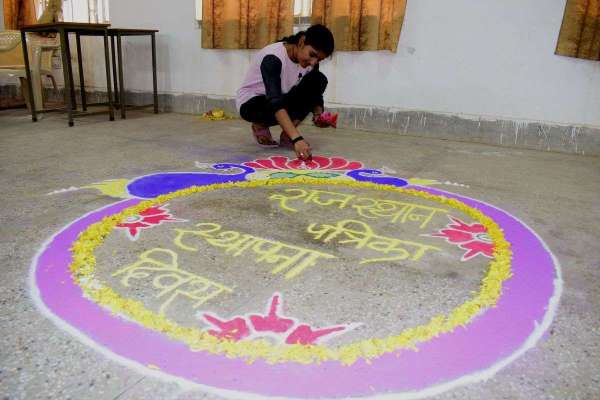 छात्राओं ने रंग उकेद दी स्थापना दिवस की शुभकामनाएं बाड़मेर। राजस्थान पत्रिका के स्थापना दिवस कार्यक्रम सप्ताह के दौरान शुक्रवार को स्थानीय एमबीसी राजकीय कन्या महाविद्यालय में आयोजित रंगोली प्रतियोगिता में छात्राओं बढ़-चढ़ कर हिस्सा लिया। छात्राओं ने रंगों के माध्यम से पत्रिका का महत्व बताया।