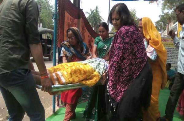 धरना पंडाल स्थल पर हुई बेहोश महिला को स्ट्रेचर में रखते हुए