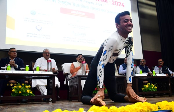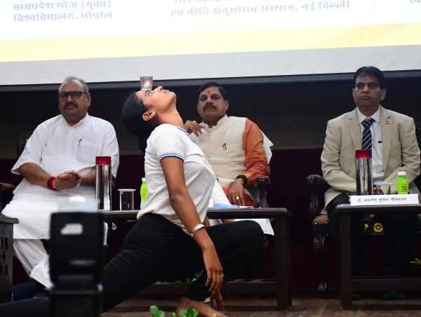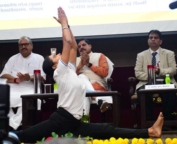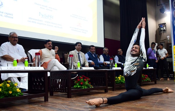 भोपाल मुख्यमंत्री डॉ मोहन यादव ने एम्प्री राष्ट्रीय हिंदी विज्ञान सम्मेलन का शुभारंभ किया आरोग्य योग संकल्प केंद्र उज्जैन के नेशनल योग खिलाड़ी शूभम शर्मा कर्ण दिव्यांग माथे पर जलता दीपक रखकर योग वृत्तिका जोशी सीएम के सामने