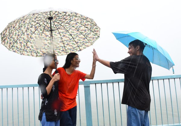 बारिश से बचने के लिए बस स्टॉप में खड़े हुए लोग