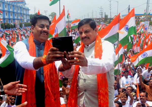 प्रदेश की सबसे बड़ी तिरंगा यात्रा के शुभारंभ के दौरान सीएम के साथ सेल्फी लेते हुए विधायक रामेश्वर शर्मा