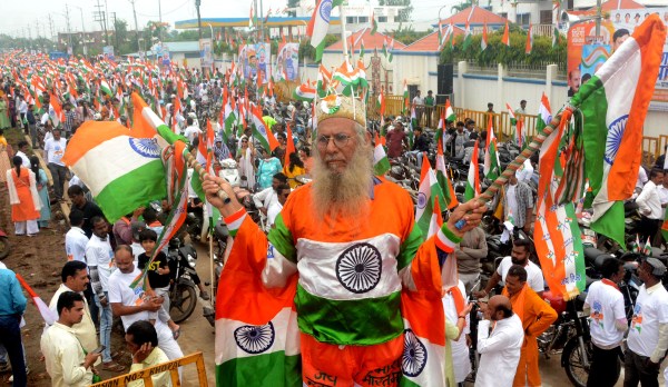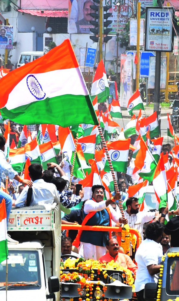प्रदेश की सबसे बड़ी तिरंगा यात्रा के साथ आगे खुली जीभ में तिरंगा लहराते हुए विधायक रामेश्वर शर्मा