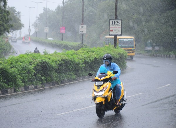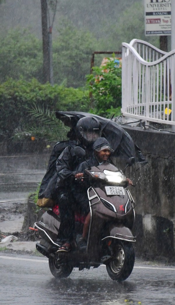 तेज बारिश में परिजन बच्चो को स्कूल ले जाते दिखे दृश्य भदभदा रोड स्थित