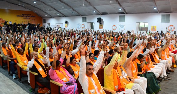 वंदे मातरम् के नारे लगाते हुए मंत्री मंडल विधायक गण कार्यकर्त्ता