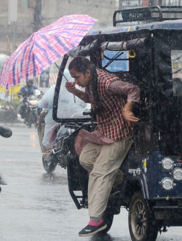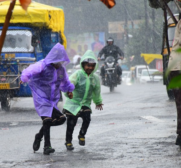तेज बारिश में स्कूल से छूटने के बाद बच्चे रेनकोट पहने भागते हुए