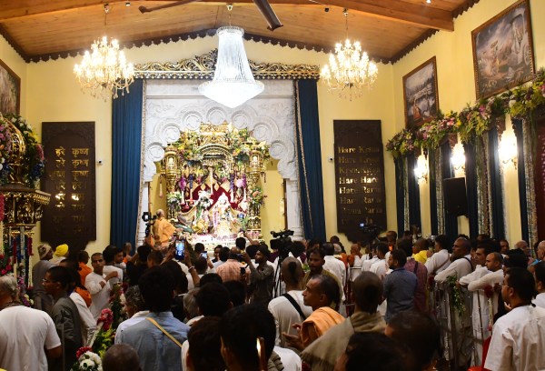 भजन में हरे कृष्णा हरे कृष्णा के कीर्तन करते हुए भक्त