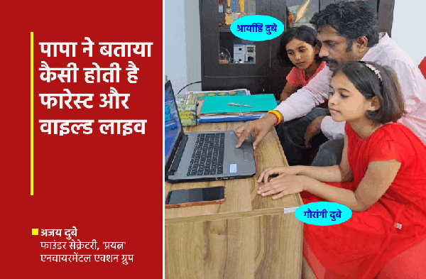 बेटियों को बताया वाइल्ड लाइफ के बारे में एनवायरमेंटल एक्शन ग्रुप 'प्रयत्न' के फाउंडर सेक्रेटरी अजय दुबे ने अपने दफ्तर से लेकर फील्ड तक अपने दोनों बेटियों को पर्यावरण, फारेस्ट, वाइल्ड लाइफ के बारे में बताया। बड़ी बेटी आर्याहि दुबे (10 साल) और छोटी बेटी गौरांगी दुबे (6 साल) ने उत्सुकता से पापा का कामकाज देखा और समझा। दोनों ही बेटियां कार्मल कान्वेट स्कूल की छात्रा हैं।