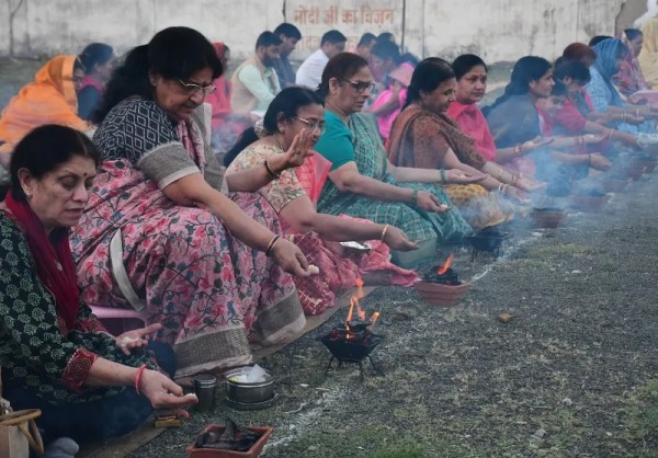 श्रद्धालु पर्यावरण शुद्धि और वैश्विक शांति के लिए दो आहूतियां देते हुए।