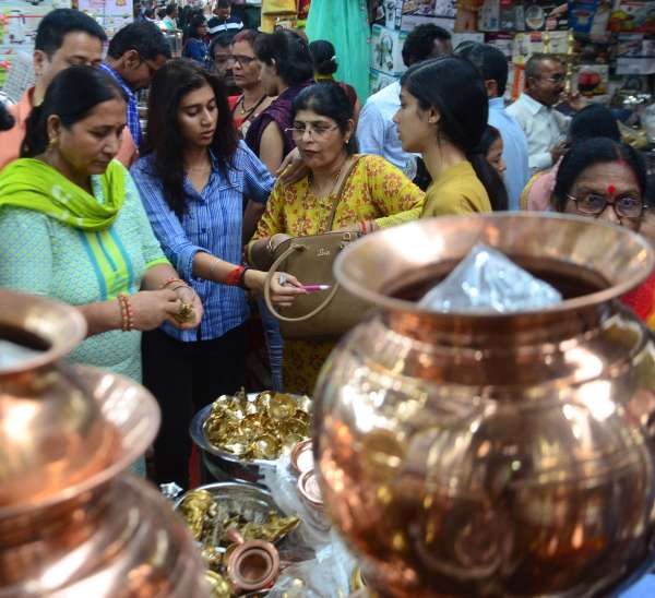 धनतेरस के अवसर पर न्यू मार्केट में वर्तनों की खरीददारी करते लोग।