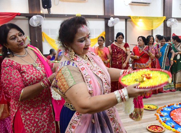 थाली हाथ में लेकर गरबा करते हुए महिलाएं