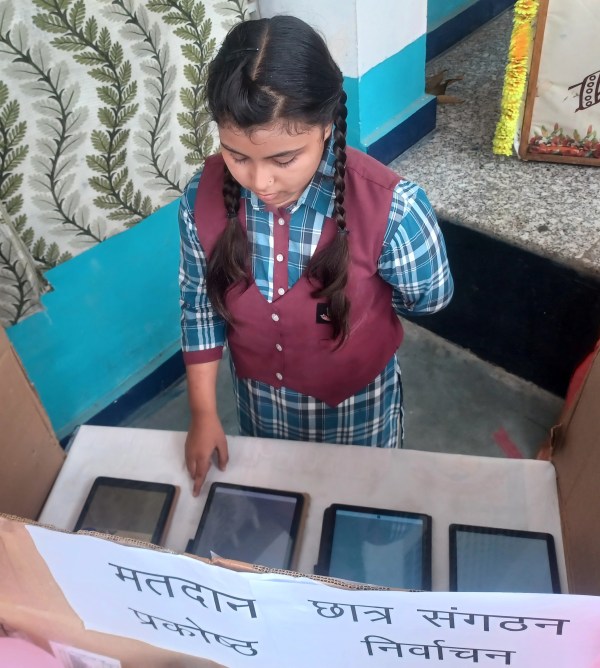 छात्र-छात्राओं ने किया मतदान मतदान ईवीएम मशीन (इलेक्ट्रॉनिक मीडिया) के माध्यम से कराया गया जिसमें टैबलेट का प्रयोग किया