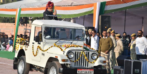 बीकानेर में 76वां गणतंत्र दिवस धूमधाम से मनाया गया। डॉक्टर करणी सिंह स्टेडियम में आयोजित मुख्य समारोह में प्रथम झांकिय ट्रैफिक को बिनेट मंत्री सुमित गोदारा सम्मानित करते। फोटो नौशाद अली