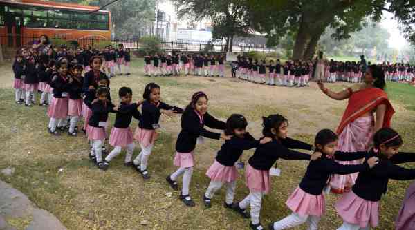 बालदिवस के अवसर पर पब्लिक पार्क में दौड़ लगाते स्कूली बच्चे।