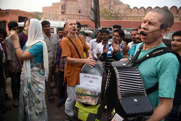 सादुलसिंह सर्किल के किनारे यह पांच रशियन नागरिक अपने तबला, हारमोनियम व मंजीरे की धून पर हरे रामा-हरे कृष्णा गाकर लोगों को संस्कृति बचाने का संदेश दे रहे है। इसके साथ ही इन पांच रशियन में दो पुरूष गाना बजाते है तो एक महिला मंजीरा बजाती है। वहीं एक महिला व एक पुरूष धार्मिक पुस्तकों को बेच रहे है।