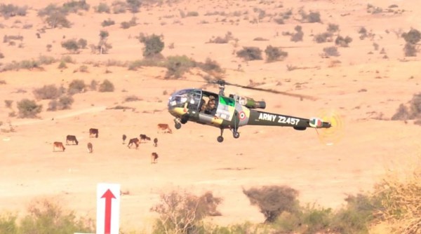 बीकानेर के भारतीय सेना की ओर से पश्चिमी सीमा पर सोमवार को रेगिस्तान मेंयुद्धाभ्यास में भारतीय सेना अपनी सटीक मारक क्षमता और तकनीक से लैस नई पीढ़ी की संरचनाओं का संयुक्त परिचालन की ताक़त को भी परखा। सेना अटैक हेलीकॉप्टर से लक्ष्यों पर हमला किया फोटो नौशाद अली