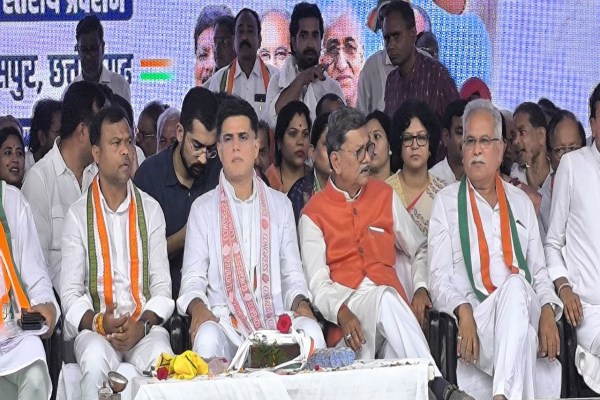 कांग्रेस की एकजुटता: पूर्व सीएम भूपेश बघेल और नेता प्रतिपक्ष चरणदास महंत साथ दिखे।