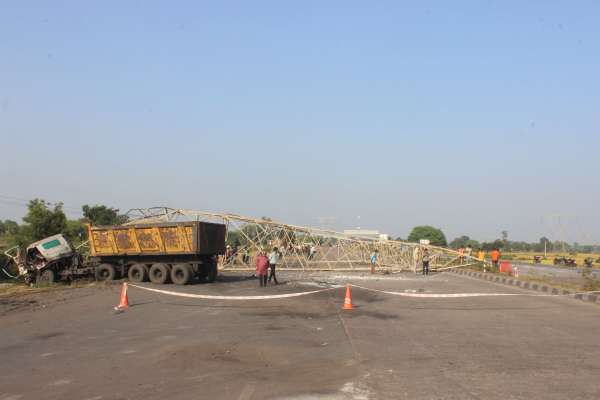 टक्कर से टावर क्षतिग्रस्त होकर ट्रक के ऊपर ही गिर गया